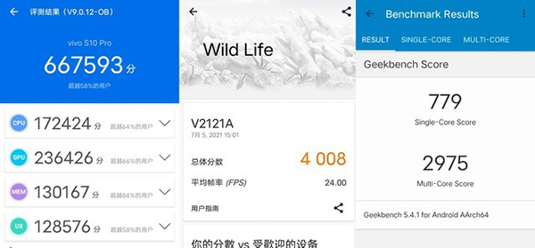 從實(shí)際跑分來看,得益于天璣1100的出色的性能和vivo自身的優(yōu)化,vivo S10系列安兔兔跑分接近67萬,3D Mark跑分則達(dá)到了4008,Geekbench 5.0單核779分,多核2975分,整體表現(xiàn)還是非常不錯(cuò)的。