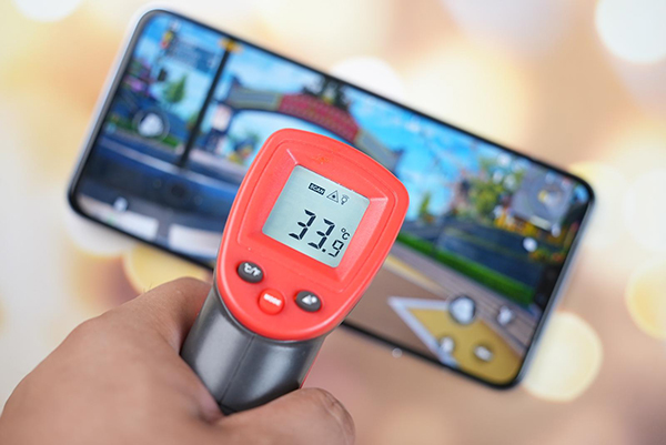 借助于VC零感散熱,更大的VC均熱板、石墨散熱膜和均熱絕緣膜的存在,手機(jī)的散熱效果良好;在室溫26℃的情況下長(zhǎng)時(shí)間游戲后的正面屏幕溫度為33.9℃,背面為32.9℃,高溫出現(xiàn)在攝像頭模組附近,最高為35℃。