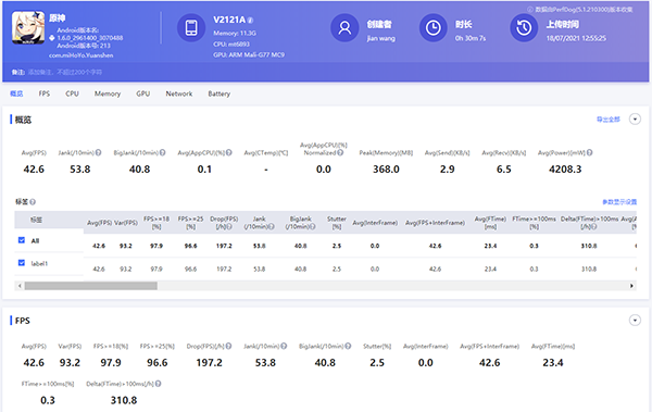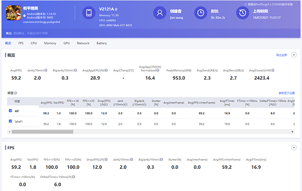 測試機(jī)型目前還不支持HDR高清的極限模式,只能開啟流暢極限模式,在該模式下,聯(lián)發(fā)科天璣1100平均幀率為59.2fps,平均每十分鐘卡頓次數(shù)為2.0,平均每十分鐘卡頓次數(shù)為0.3,能耗值為2423.4。
