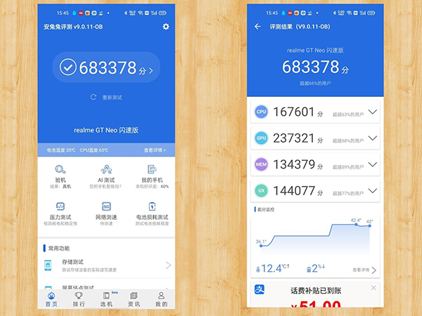 打開安兔兔直接進(jìn)行了跑分測(cè)試,在經(jīng)歷數(shù)分鐘的等待后,跑分結(jié)果終于出現(xiàn)了,我的這款realme真我GT Neo閃速版的跑分高達(dá)683378分,可以說這個(gè)成績(jī)非常不錯(cuò),將天璣1200旗艦處理器的性能發(fā)揮到了極致,整體性能接近驍龍870處理器?;幌拢绻麑⑹謾C(jī)放到冰箱進(jìn)行測(cè)試,跑分會(huì)不會(huì)再翻一番?值得一提的是跑分軟件提供的跑分?jǐn)?shù)據(jù)僅供參考,其并不是唯一的參考方向,并且跑分可能受很多因素的影響,例如周邊環(huán)境溫度、手機(jī)運(yùn)行情況等等!