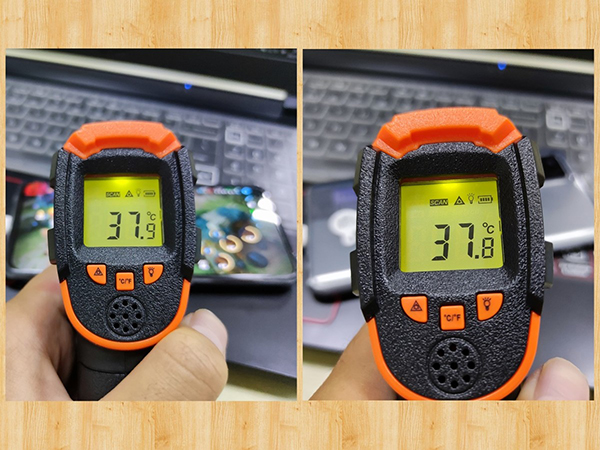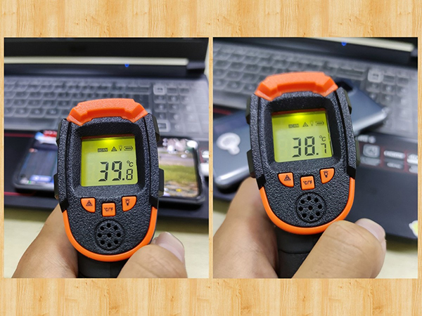 游戲過程中,為了探究手機(jī)的發(fā)熱情況。在游戲進(jìn)行了一段時(shí)間后,我分別對(duì)手機(jī)屏幕、背部進(jìn)行測(cè)溫,最后手機(jī)的散熱效果令我十分滿意。在室溫為32度的情況下,屏幕測(cè)得的手機(jī)溫度是37.9度;手機(jī)背部測(cè)得的溫度是37.8度;整體而言散熱效果十分不錯(cuò)。不得不說這個(gè)強(qiáng)大的鋼化VC液冷散熱發(fā)揮的作用十分明顯,在保證性能全發(fā)的情況下,溫度控制的依然十分不錯(cuò),沒有出現(xiàn)過高的情況發(fā)生。