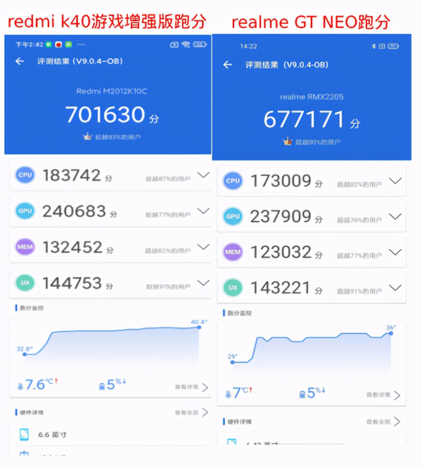 最近看到有用戶在糾結(jié)這個(gè)紅米K40游戲版和realme真我GT Neo這兩款機(jī)型,不知道哪個(gè)機(jī)型玩游戲性能更強(qiáng)一下,因此在這里來進(jìn)行一下對(duì)比了,首先性能測(cè)試,先簡(jiǎn)單跑個(gè)分,同時(shí)天璣1200處理器,但K40游戲版做得優(yōu)化會(huì)更優(yōu)一些,從跑分也能體現(xiàn)出來。