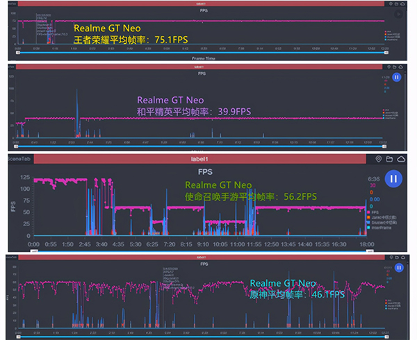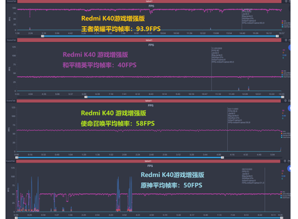 可以看出,在3款游戲的實(shí)測(cè)中,K40游戲版的FPS均是比真我GT Neo更高且穩(wěn)一些,在最耗性能的《原神》游戲,真我GT Neo呈現(xiàn)出的是“心電圖”,而K40游戲版則是比較平穩(wěn),并且能始終保持在50FPS左右,實(shí)戰(zhàn)表現(xiàn)更出色。
