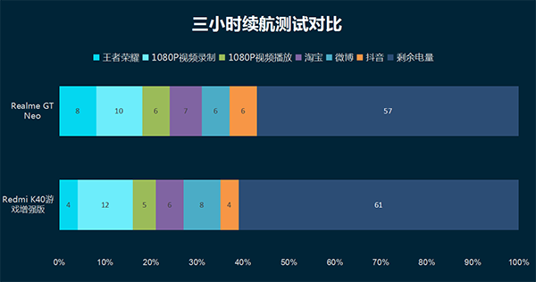跟朋友用兩部手機(jī)用相同的界面操作使用了三小時(shí),K40游戲增強(qiáng)版的電量比真我GT Neo多了4%,充電速度上,前者也比后者快了將近10分鐘!Redmi又贏了。