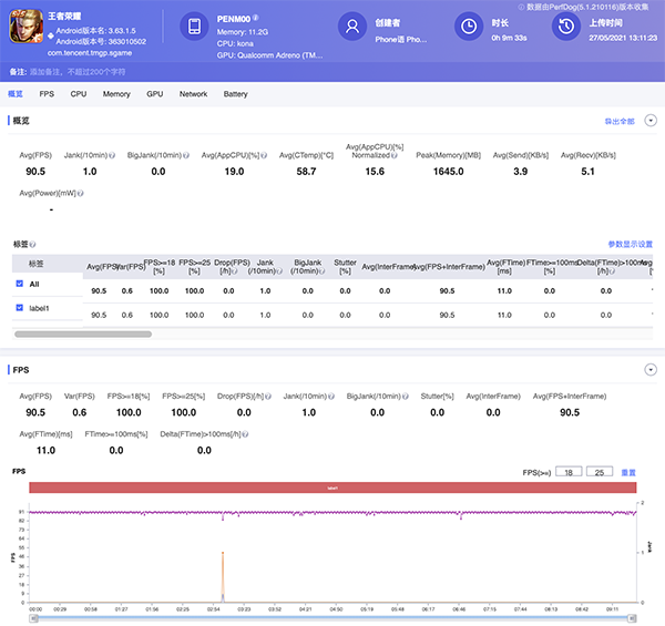 在實際針對《王者榮耀》的游戲幀率測試中,我們可以發(fā)現(xiàn),即使開啟高幀率模式運行,OPPO Reno6 Pro+也依然保持了十分穩(wěn)定的幀率輸出表現(xiàn),整體平均幀率高達(dá)90.5FPS,這使得我們在游戲過程中能夠十分流暢地完成全局,帶來了相當(dāng)不俗的實際游戲表現(xiàn)。