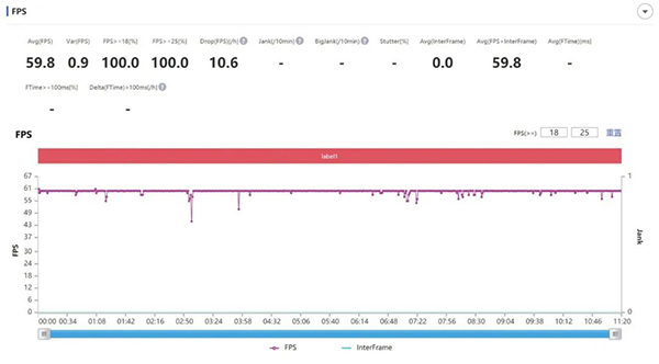 在“高”幀率、“超高”分辨率和“標(biāo)準(zhǔn)”畫(huà)質(zhì)的《王者榮耀》里,realme真我Q3的平均幀率達(dá)到59.8fps。