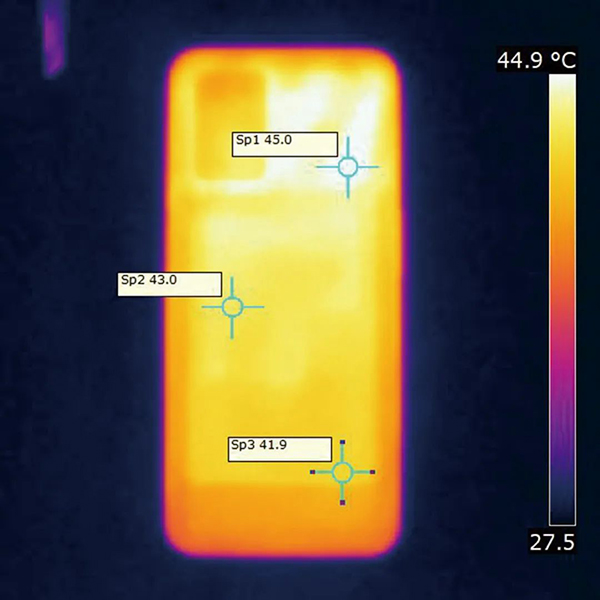 10分鐘《原神》游戲后,通過(guò)紅外測(cè)溫儀測(cè)得realme真我Q3機(jī)身最高溫度為45℃。