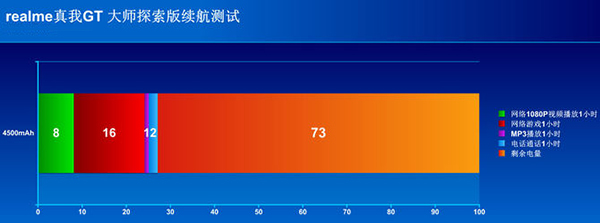 我們也針對(duì)真我GT大師探索版進(jìn)行了4小時(shí)的高強(qiáng)度續(xù)航測(cè)試,首先進(jìn)行1個(gè)小時(shí)網(wǎng)絡(luò)1080P視頻播放,一個(gè)小時(shí)后消耗8%的電量,之后進(jìn)行1個(gè)小時(shí)的游戲,在開(kāi)啟GT模式下消耗了16%電量,再進(jìn)行1小時(shí)MP3播放,消耗了1%的電量,進(jìn)行1小時(shí)5G通話(huà)測(cè)試,消耗了2%的電量,4小時(shí)總共消耗了27%的電量,剩余73%的電量。