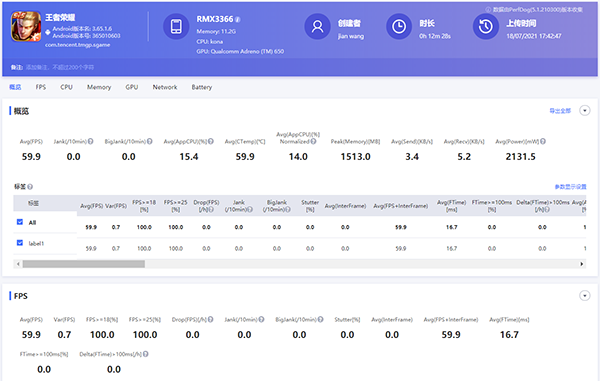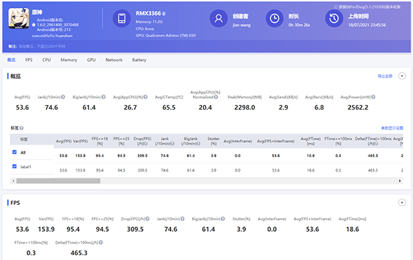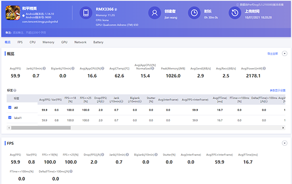此次測試游戲分別《王者榮耀》、《和平精英》、《原神》,三款游戲進行連續(xù)不間斷實測,運行12分鐘極限畫質(zhì)特效快開《王者榮耀》緊接著運行60幀HDR極限模式下的《和平精英》30分鐘,然后游戲退出立即進行30分鐘極限畫質(zhì)下60幀《原神》的實測,通過perfdog來記錄最終平均幀率、卡頓次數(shù)及嚴重卡頓次數(shù),真我GT大師探索版的實際表現(xiàn)究竟如何呢?