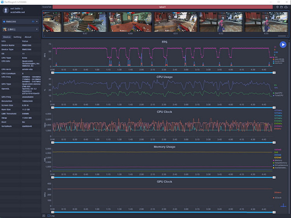 仔細觀察GPU頻率不難發(fā)現(xiàn),真我GT大師探索版在開啟“GT模式”后,幾乎全程將驍龍870的GPU發(fā)揮到了滿血狀態(tài)。這其實也從另外一個側(cè)面印證了驍龍870的確有著不俗的發(fā)熱控制,以及真我GT大師探索版雖然有著輕薄的機身設計,卻依然可以做好旗艦級移動平臺散熱的事實。