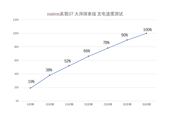 真我GT大師探索版使用4500mAh的大電池,并且支持65W的智慧閃充,還帶來了適配器過載保護、閃充條件鑒定保護、接口過載保護、電池電流、電壓過載保護、電池熔絲保護等智能五芯保護,提高充電的安全性。實際測試可以看到,充電10分鐘已經(jīng)能達到31%的電量,從0%-100%的充電時間是35分鐘左右,充電速度非???。
