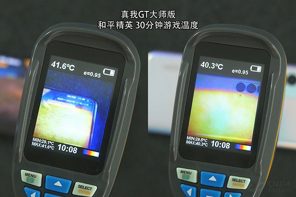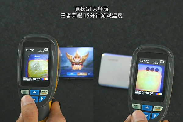 游戲溫度上,真我GT大師版加持了VC液冷散熱我們玩了15分鐘左右,正面最高溫度為41.7℃,背面最高溫度為38.9℃,并不算燙手。