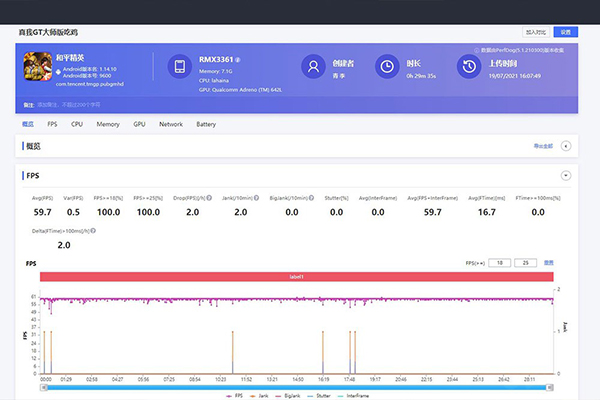 和平精英目前同樣也是不支持超高清畫質和90Hz模式,等后續(xù)系統(tǒng)更新后支持90Hz模式,也是沒問題的,我們現在用的是流暢畫質+極限幀率測試,在游戲中跳傘的時候感覺到了有些許卡頓情況,其余時間無論我們是開車、鋼槍、搶空投幀率都還算是比較平穩(wěn)的,最終在我用AWM精準爆頭敵人后,成功吃雞,總計耗時30分鐘,平均幀率在59.7FPS,平均每10分鐘卡頓2次,幀率很穩(wěn)定,AI游戲穩(wěn)幀效果確實不錯。