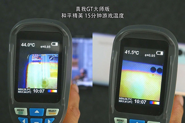 但溫度其實我們在游戲15分鐘左右時就感覺有點熱了,正面溫度測了一下來到了44℃左右,背部溫度在41.5℃左右,還好只是屏幕有點燙。