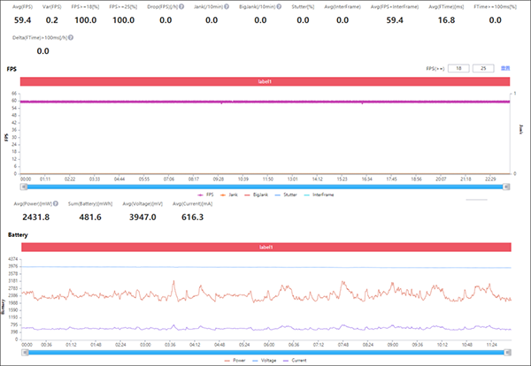 而這個游戲性能的表現(xiàn)還是得看看的,循例還是用騰訊兩款經(jīng)典游戲來測試,一是「王者榮耀」,將游戲畫質(zhì)切換為高幀率、超高分辨率、極致畫面質(zhì)量,開啟抗鋸齒,因為還沒有開放90fps,realme真我GT大師探索版的表現(xiàn)非常的好,幀率一馬平川,穩(wěn)定在60fps附近,平均幀率為59.4fps。