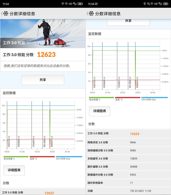其次,我們使用近日剛剛進(jìn)行了徹底更新的PCMARK對(duì)Axon30 5G進(jìn)行了綜合測試。新版的PCMARK換用了全新的64位測試項(xiàng)目,更能發(fā)揮出現(xiàn)代手機(jī)的硬件潛力。不過比起不俗的得分,Axon30 5G在PCMARK測試的統(tǒng)計(jì)數(shù)據(jù)中所表現(xiàn)出幾乎沒有降頻的性能表現(xiàn),更加引起了我們的注意。