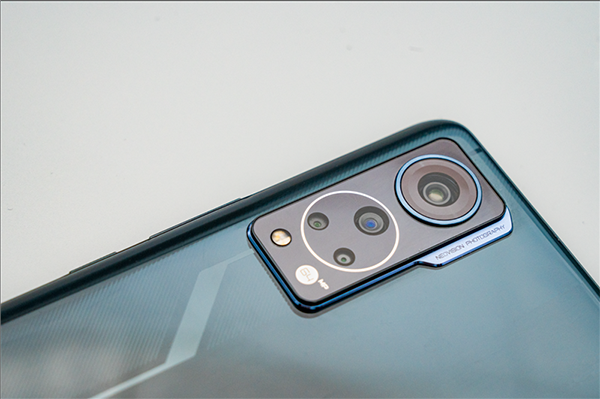 和上代一樣,中興Axon30 5G依舊選擇了后置四攝方案,不過(guò)改成了「天使眼」設(shè)計(jì)。如下圖所示,它將主攝和另外三顆攝像頭分別放到了兩個(gè)環(huán)形區(qū)域內(nèi),并且下方圓環(huán)內(nèi)的攝像頭改成了三角形排布,好看與否暫且不去談?wù)?,但確實(shí)挺有特點(diǎn)。