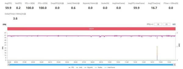 在如今最熱門的《王者榮耀》游戲中,采用的是極致畫質(zhì)+高幀率+超高分辨率的配置,中興Axon30幾乎全程穩(wěn)定在滿幀60幀的水平,游戲中無論是對線還是團(tuán)戰(zhàn)時(shí),都沒有卡頓和畫質(zhì)波動(dòng)。游戲全程平均幀率在59.9幀。