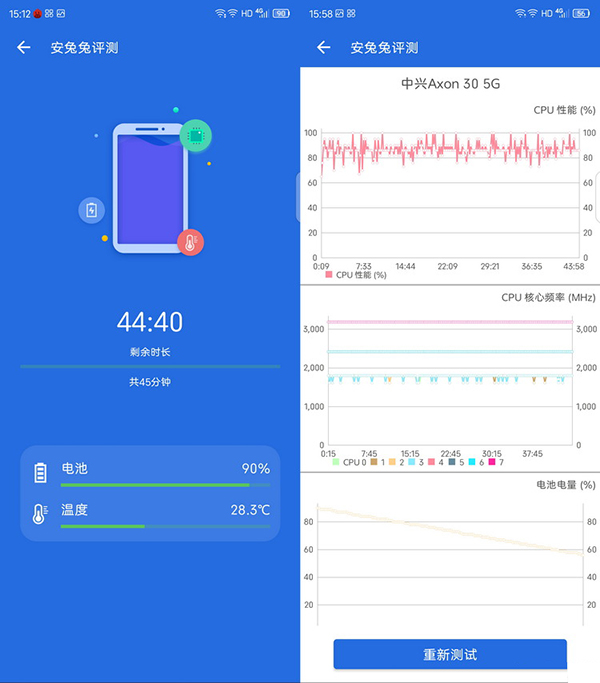 在室溫條件下,我們使用安兔兔評測V9的新版壓力測試工具,對Axon30 5G進行了“拷機”。與過去的版本相比,安兔兔最新的壓力測試將時間從15分鐘延長到了45分鐘,大幅提高了對手機長時間持續(xù)散熱能力的要求??梢钥吹皆谡麄€長達45分鐘的測試里,處于滿負載狀態(tài)下的Axon30 5G CPU居然幾乎沒出現(xiàn)降頻,特別是3.2GHz的“超大核”可以做到一直滿血運行,這確實也足以說明其散熱設計的出色表現(xiàn)。