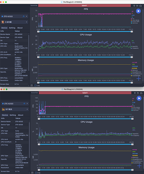 游戲幀率表現(xiàn)(上:王者榮耀;下:和平精英)