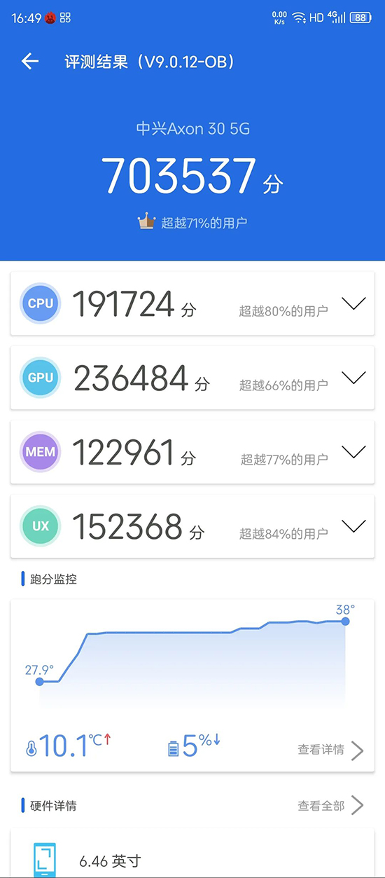 得益于高通驍龍870移動平臺、UFS3.1閃存和內(nèi)存融合技術,中興Axon30 5G在《安兔兔評測》中獲得了703537分成績,其中CPU得分191724,GPU得分236484,完全能夠在當下高通驍龍870旗艦手機性能排行中占據(jù)前排位置。在主要考察CPU性能的GeekBench 5.1中,中興Axon30 5G單線程評分為991,多線程評分為2992;在主要考察GPU性能的3DMark Wild Life測試中,它的總體得分為4175分。從這些測試結果來看,中興Axon30 5G的理論性能表現(xiàn)都很出色。