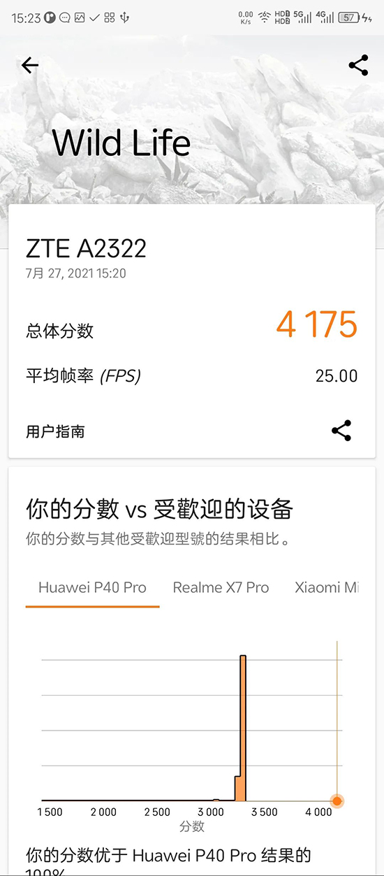 3DMark Wild Life測試中,中興Axon30 5G的總體得分為4175分。