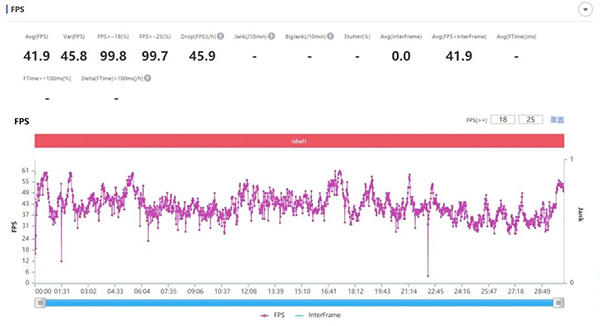 半小時《原神》高負(fù)載測試中,中興Axon30 5G的平均幀率為41.9fps。