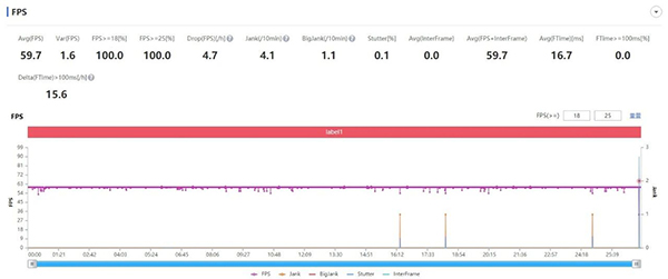 游戲?qū)崪y(cè)下來(lái),王者榮耀、和平精英、王牌戰(zhàn)士等主流游戲都能保持60fps滿幀運(yùn)行,用PerfDog監(jiān)控可以看到,在近半小時(shí)的游戲中,全程都保持著穩(wěn)定的輸出,幾乎沒(méi)有波動(dòng)(圖為和平精英測(cè)試數(shù)據(jù)),表現(xiàn)非常穩(wěn)定。