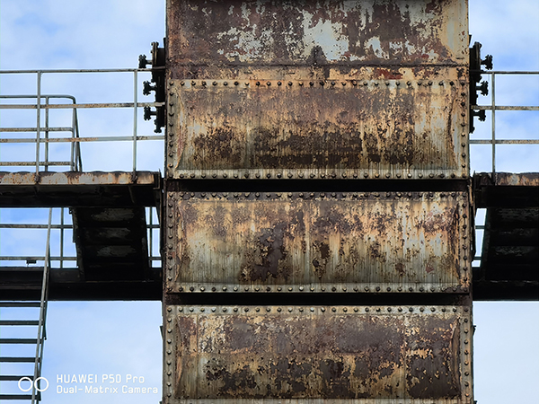 這部分主要有兩個(gè)可說(shuō)的點(diǎn):其一,3.5倍長(zhǎng)焦鏡頭拍攝的圖片亮度看上去和主攝大致相同,換句話說(shuō),無(wú)需擔(dān)心這顆鏡頭的進(jìn)光量問(wèn)題;另外,10倍變焦成像素質(zhì)令人滿意。從樣張中可以看到,建筑物上的鉚釘形狀清晰可見(jiàn),并且銹跡圖案整體形狀得到了很好保留。