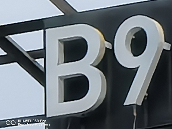 即便長(zhǎng)焦部分,依舊選擇了之前曾多次的出現(xiàn)在我們?cè)u(píng)測(cè)文章中的「B9」作為示例。標(biāo)準(zhǔn)模式下,其實(shí)是很難看清楚建筑物字樣標(biāo)識(shí)的,將華為P50 Pro拉到100倍變焦之后,就得到了下面這張圖片。處理策略上,它更偏向清晰度,圖片邊緣沒(méi)有太多涂抹痕跡。