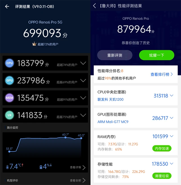 理論上來說,OPPO Reno6 Pro所搭載的這款天璣1200與驍龍870主流機(jī)型的成績幾乎持平。甚至在多核性能上要更強(qiáng),所以O(shè)PPO Reno6 Pro的性能至少是達(dá)到了旗艦級(jí)水準(zhǔn)。想要測(cè)試一款處理器的性能,跑分是少不了的,經(jīng)過實(shí)測(cè),OPPO Reno6 Pro在娛樂兔兔和魯大師的跑分分別為699093和879964的成績,3DMark的Wild Life和Wild Life Extreme測(cè)試中,OPPO Reno6 Pro分別獲得了4169和1286分,在當(dāng)今一眾的旗艦機(jī)中也是非常出色的了。