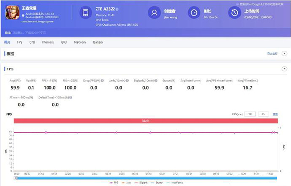 中興Axon30屏下版在《王者榮耀》60幀模式下的表現(xiàn),手機(jī)采用默認(rèn)模式未進(jìn)行任何優(yōu)化,游戲時長約12分鐘,具體實測成績?nèi)缦拢?