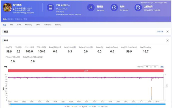 需要注意的是,當(dāng)測試完畢后《王者榮耀》立即進(jìn)入《和平精英》進(jìn)行實測采用HDR極限模式,游戲時長約30分鐘,在該模式下,平均幀率為59.9fps,平均每十分鐘卡頓次數(shù)為0.3,平均每十分鐘卡頓次數(shù)為0.0。通過實測發(fā)現(xiàn),中興Axon30屏下版整體表現(xiàn)還是符合其定位的。
