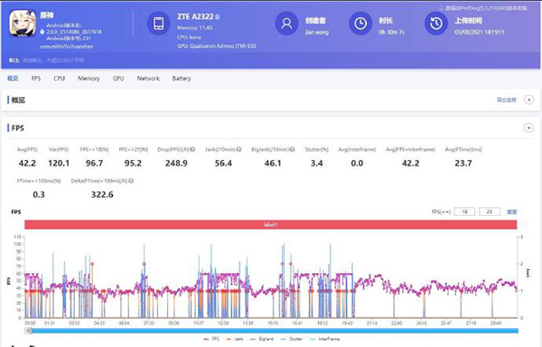 此次測試游戲分別《王者榮耀》、《和平精英》、《原神》,三款游戲進(jìn)行連續(xù)不間斷實測,運(yùn)行12分鐘極限畫質(zhì)特效快開《王者榮耀》緊接著運(yùn)行60幀HDR極限模式下的《和平精英》30分鐘,然后游戲退出立即進(jìn)行30分鐘極限畫質(zhì)下60幀《原神》的實測,通過perfdog來記錄最終平均幀率、卡頓次數(shù)及嚴(yán)重卡頓次數(shù),中興Axon30屏下版的實際表現(xiàn)究竟如何呢?