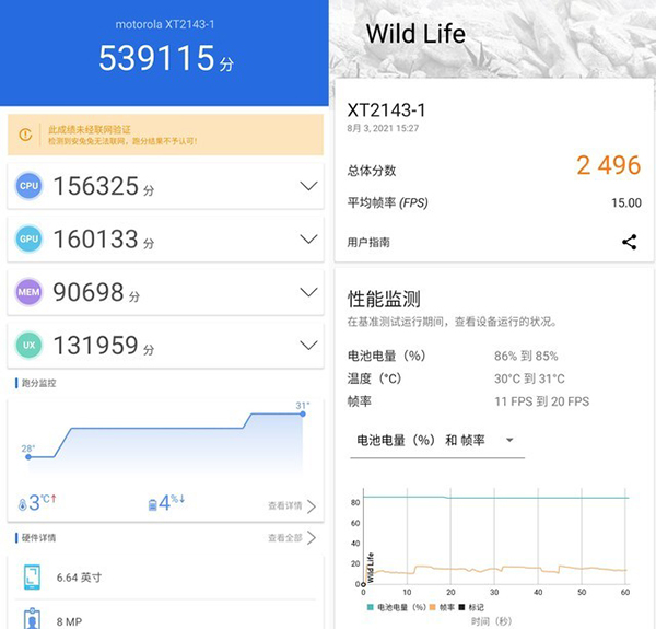 搭載了驍龍778G的摩托羅拉edge輕奢版在安兔兔中獲得了539115分的成績(jī);在3DMark Wild Life測(cè)試中摩托羅拉edge輕奢版獲得了2496分的成績(jī),整體性能表現(xiàn)可圈可點(diǎn)。