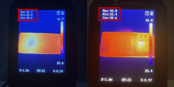 溫度方面,我們也有進行監(jiān)測。高強度游戲約一個小時后(兩局《王者榮耀》、一局《和平精英》),正面最高溫度在42℃左右,背面最高溫度在43℃左右,算不上涼爽,但屬于人體能夠接受的溫度,在5G時代,很多手機高強度游戲后表層溫度都是45℃往上跑,那種感覺真的不太舒適。