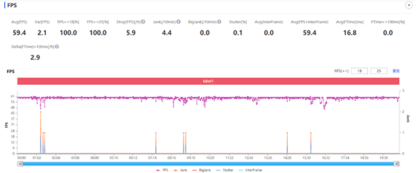 《和平精英》實測,畫面設(shè)置為HDR高清、極限幀數(shù)(滿幀60幀)。20分鐘后,發(fā)熱輕微,整個過程中畫面流暢順滑,平均幀率59.4。
