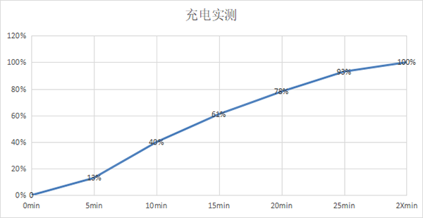 在我們的實(shí)測中,徹底用光電量到關(guān)機(jī)的情況下,使用原裝充電器進(jìn)行充電,25分鐘充到了93%,然后一個(gè)沒注意,它就在30分鐘前充到了100%。與其他手機(jī)不同,它在別人普遍很慢的后半段沖刺起來賊猛,甚至筆者都來不及記錄下最后充滿的瞬間。