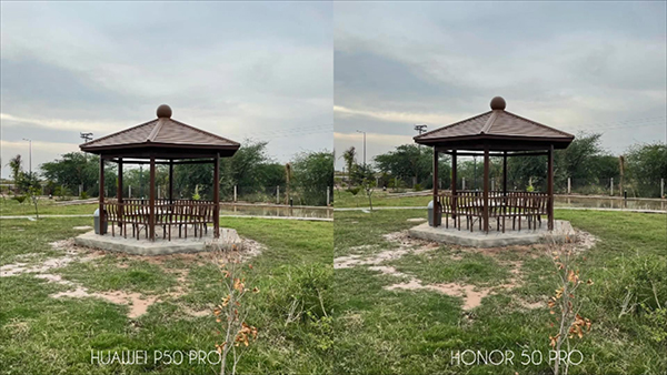 第一組照片的拍攝場景是在室外,在草地中有一個古色古香的亭子。從照片的大范圍效果來看,華為P50 Pro拍攝的照片亮度比較高,榮耀50 Pro拍攝的照片亮度稍微低一些。