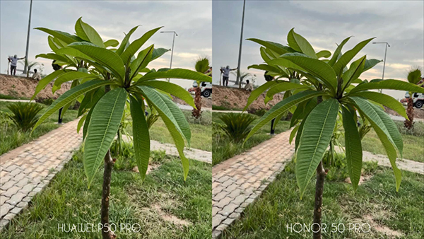 比如照片下方的綠植拍攝的效果,華為P50 Pro拍攝的照片中的亮度比榮耀50 Pro拍攝的照片亮度反而低一些,榮耀50 Pro拍攝的亮度更高。