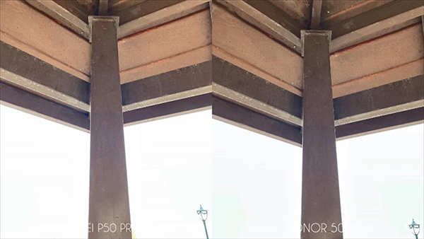 第四組拍攝的照片效果區(qū)別也比較明顯,被拍攝的主體是在亭子內(nèi)部拍攝立柱,但是在華為P50 Pro和榮耀50 Pro的效果表現(xiàn)方面卻呈現(xiàn)除了相反的表現(xiàn)。