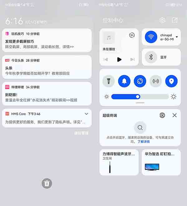 而在控制中心最重要的,則是超級終端這一新功能,對于華為生態(tài)內(nèi)的部分設(shè)備,可以通過快速“貼貼”的方式進行連接,對比傳統(tǒng)的連接方式更為直觀且迅速。這對于立志于打造1+8+N生態(tài)的華為來說,在便用性上邁出了相當(dāng)重要的一步。
