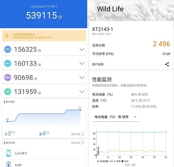 搭載了驍龍778G的摩托羅拉edge輕奢版在安兔兔中獲得了539115分的成績(jī);在3DMark Wild Life測(cè)試中摩托羅拉 edge 輕奢版獲得了2496分的成績(jī),整體性能表現(xiàn)可圈可點(diǎn),穩(wěn)扎穩(wěn)打的中端機(jī)水平。
