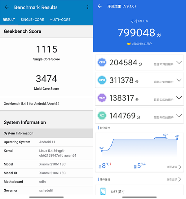 按照慣例,還是用不同跑分軟件走一遍過場,給需要的小伙伴作個(gè)參考,GeekBench 5單核得分是1115、多核達(dá)到3474,安兔兔則是799048分。