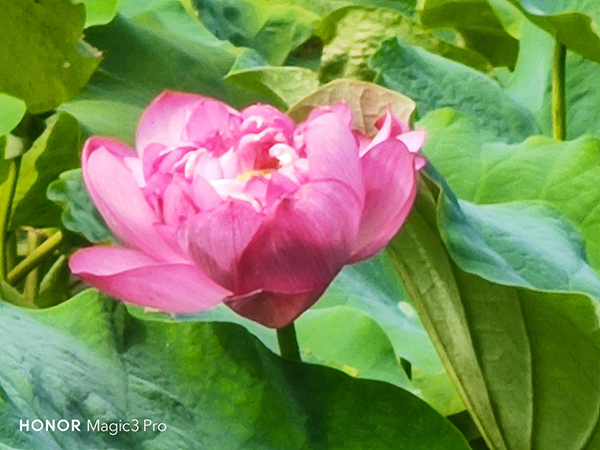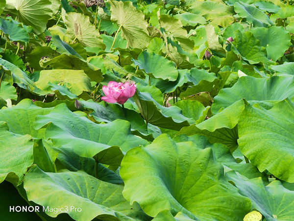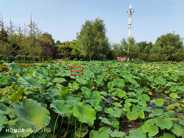 不過長焦的主要功能還是“隔空取物”,筆者用榮耀Magic3 Pro拍攝了極遠的一朵荷花,并分別用10倍混合變焦以及50倍數字變焦做了拍攝對比,得益于榮耀Magic3 Pro長焦鏡頭的超高像素,即便是10倍混合變焦遠距離拍攝,所得到的樣片也是達到了當前主流次旗艦主攝鏡頭的水準,清晰度非常高。而至于50倍數字變焦后的拍攝也能表現出荷花的樣貌,沒有明顯的模糊和像素化,當然最難的是沒有虛焦,這和榮耀Magic3 Pro的OIS+EIS拍照預覽雙重防抖技術應是分不開的。至于100倍數字變焦筆者這里就不做展示了,日常拍攝基本20-30倍變焦足夠了,100倍完全是望遠鏡級別,大家可以自行體驗。