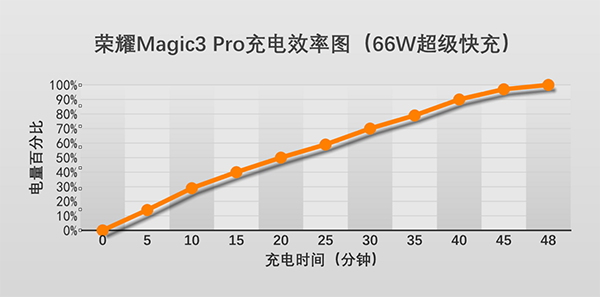 在這個(gè)電池充電方面,榮耀Magic3 Pro自身配備4600mAh大電池并搭載了66W有線超級(jí)快充,且支持50W無(wú)線超級(jí)快充/車(chē)充以及無(wú)線反向充電,可以說(shuō)是集成了全行業(yè)最領(lǐng)先的配置,對(duì)于這樣的榮耀Magic3 Pro,基本可以沒(méi)有用電焦慮可言了。下面是筆者對(duì)榮耀Magic3 Pro進(jìn)行66W超級(jí)快充的實(shí)時(shí)曲線,大家可以看一下。