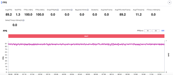 《王者榮耀》游戲畫質(zhì)特效全開,為90幀模式。根據(jù)軟件記錄的數(shù)據(jù),游戲平均幀率達到89.2幀,高幀模式下也能保證非常穩(wěn)定的幀數(shù),波動非常小。畫面流暢度要比普通60幀有不少提升,觸控操作也十分跟手。