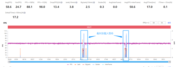 一小時連續(xù)游戲幀率記錄如上,中間兩部分的異常波動,其實(shí)是單局游戲結(jié)束后重開下一局,等待配對和地圖載入導(dǎo)致,即使這樣全程平均幀率也達(dá)到了58.6FPS,實(shí)際游戲過程是完全流暢的。