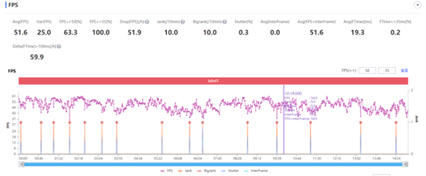 測試完成,Perfdog記錄平均幀率達(dá)到了51.6FPS,整體有波動,但基本沒有出現(xiàn)幀率過低情況,其中幀率≥50FPS的占比達(dá)到了63.3%,而全程100%時間幀率維持在35FPS以上,游戲體驗(yàn)是保證了足夠順暢的。