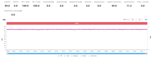 首先是《王者榮耀》,畫質(zhì)選擇極致預(yù)設(shè),幀率選擇“超高”(90FPS),單局人機(jī)幀率記錄如圖,可以看到幀率曲線緊貼90FPS拉出了一條直線,全程波動僅0.8,完全是小數(shù)點(diǎn)以后的數(shù)量級。實(shí)際全程幀率100%維持在59FPS以上體驗(yàn)非常絲滑。幾項(xiàng)代表掉整和卡頓的參數(shù)都為零,這代表榮耀Magic3 Pro的性能能完美駕馭《王者榮耀》,如果是喜歡玩一些比較考驗(yàn)微操的英雄,玩起來會有得心應(yīng)手的暢快。